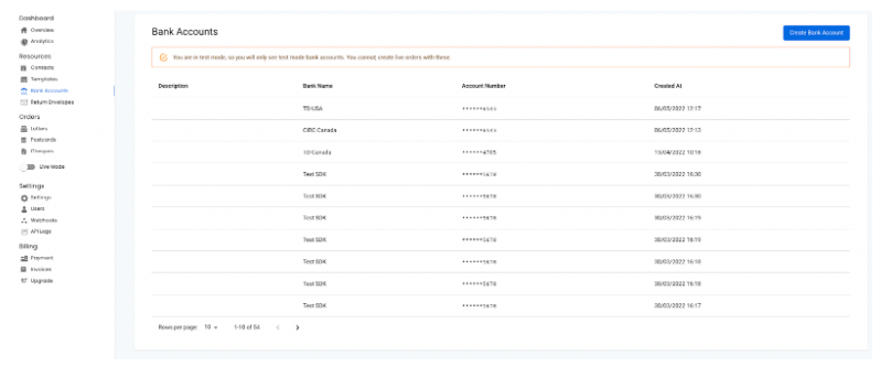 3. You can visit the ‘Bank Accounts’ section to add your bank account details, like name, account number, and transit number. It helps PostGrid auto-fill the information on your checks, saving you the trouble of entering it each time.